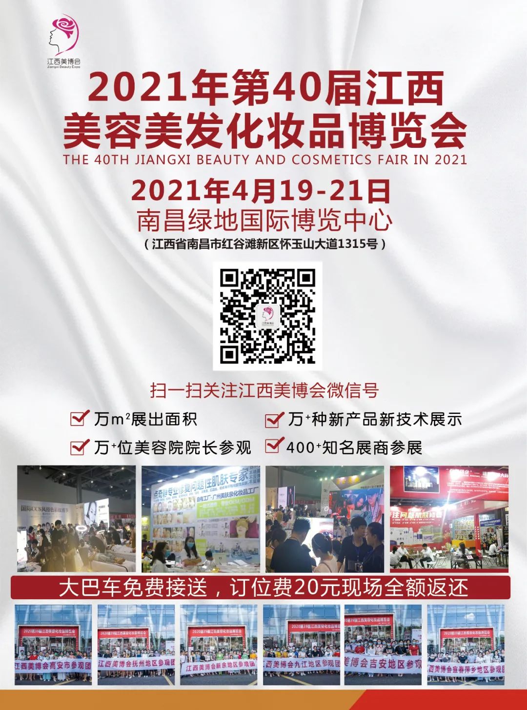 由江西汇中展览广告有限公司承办的江西美博会自2000年起每年举办两届,至2020年8 月已成功举办了39届,赢得了业界人士的一致好评。主要展示有皮肤管理、头疗、汗蒸房、美容院护肤品、美体产品、纤体减肥产品、纹身纹绣、医美、产后修复、私密养护、徒手整形、美容仪器、保健养生水疗SPA产品及设备、香薰、美甲产品及工具、祛斑祛疤祛痘、原料、OED/ODMD等供应链产品、日用化妆品、洗涤及个人护理用品、内衣、彩妆、香水、婴幼儿护肤品、口腔护理用品、护眼、新零售微电商等全产业链展示等,是您招募经销商、代理商、销商、加盟连锁及展示企业风采的平台。