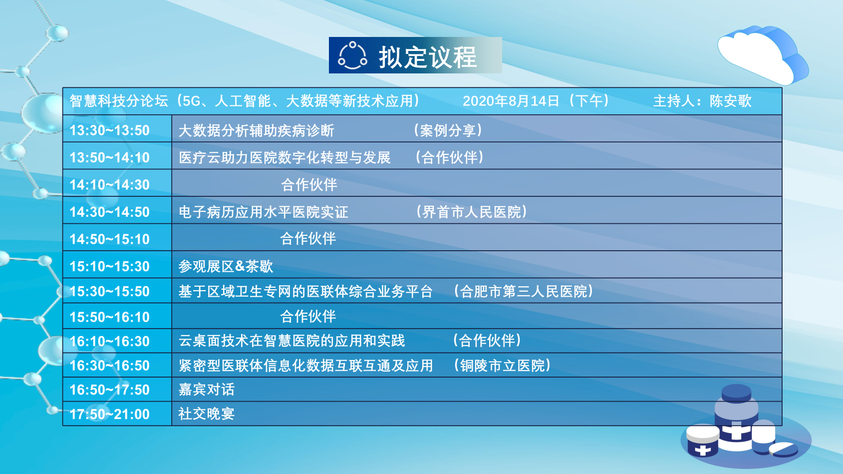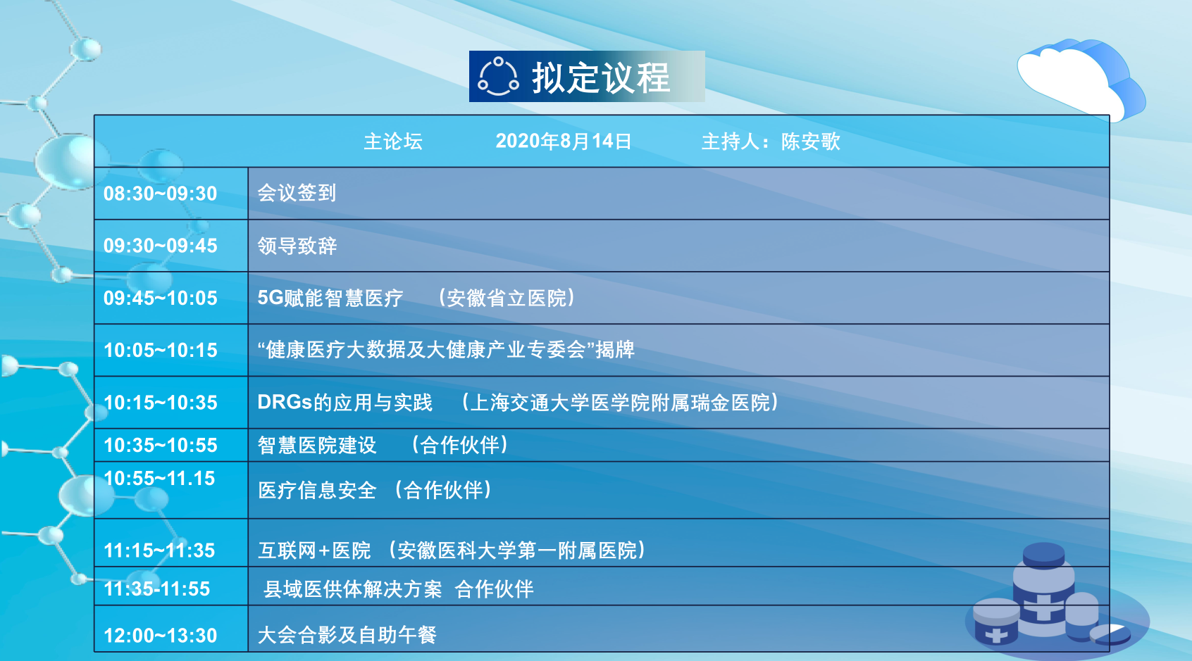 为加快推进全省卫生健康信息化建设,提升信息化应用水平,促进智慧医疗健康发展,推动信息技术与医疗健康创新融合,实现信息共享、资源整合、便民惠民。安徽省首席信息官协会定于2020年8月14日在安徽合肥市包河福朋喜来登酒店,召开“新基建助力智慧医疗”为主题的2020安徽省智慧医疗和大健康产业信息化创新峰会。