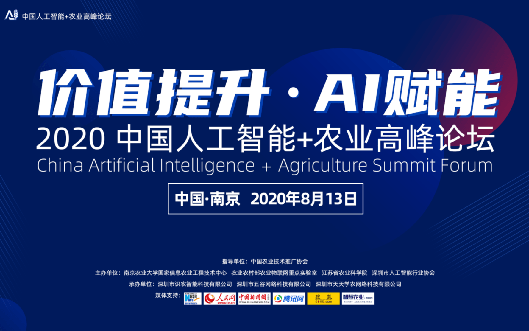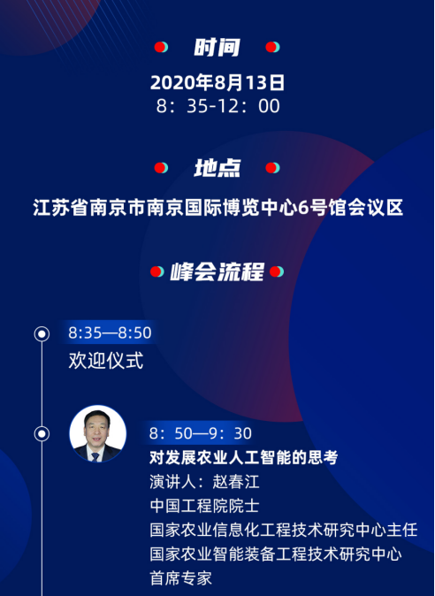 为了推动人工智能技术与农业现代化深度融合和发展,在中国农技推广中心的指导下,中国人工智能+农业组委会决定在“第五届中国(南京)国际智慧农业博览会”期间,于2020年8月13日举办“2020中国人工智能+农业高峰论坛”。