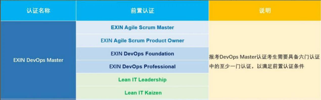 为进一步满足全球企业数字化能力建设的需求,持续提升证书的含金量,EXIN国际信息科学考试学会,于(2020年2月27日)正式发布 《EXIN DevOps、敏捷及精益认证体系的前置认证规则》,对于想要获取EXIN DevOps Master、EXIN Agile Scrum Master、EXIN DevOps Professional、EXIN Lean IT Leadership及EXIN Agile Scrum Master认证的考生,自2020年2月27日起均需先获得相应前置认证,具体前置认证规则请参照以下: