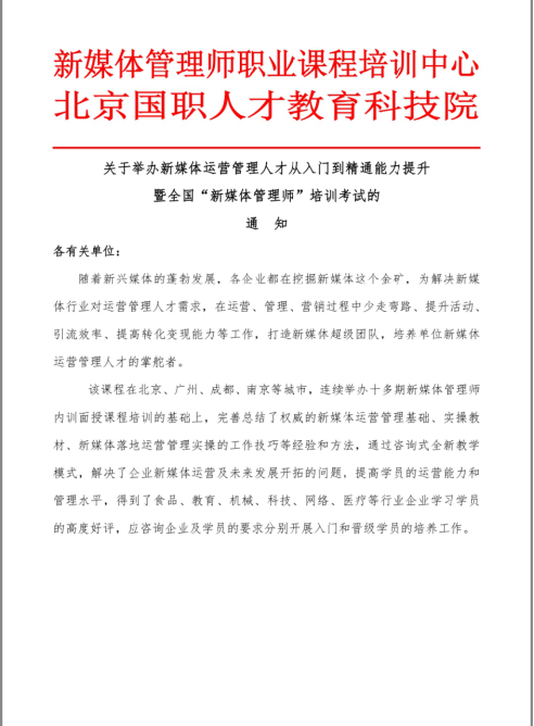 2、经典实操案例授课:针对新媒体运营管理人才量身定制,从初级入门到高级案例实操精讲培训课程体系,从新媒体思维、核心价值、政策到新媒体矩阵搭建、工具使用、高级引流;从活动、社群、用户、策划到落地运营、诊断、数据分析;从顶层布局、资源整合到团队打造管理、危机公关等采用线上能力提升、现场实操演练、直播实时更新相结合的全新教学模式;权威身份认可:经培训考核通过的学员由国家职业资格培训鉴定试验基地颁发新媒体管理师《新职业技能项目证书》,该证书在国家职业资格培训鉴定实验基地网上查询;