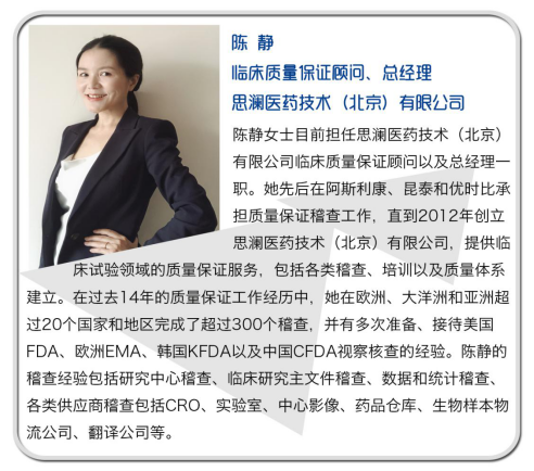 十八、如何准备并应对客户稽查/药监核查:陈 静 临床质量保证顾问、总经理思澜医药技术(北京)有限公司本模块共2次小节培训,培训要点如下: