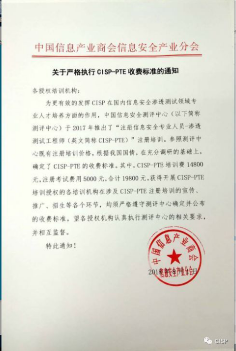 为提高各单位信息安全整体水平,加强信息安全人员专业技能,促进信息安全人员持证上岗,现组织开展注册信息安全专业人员攻防领域(CISP-PTE)培训及认证工作,此认证是信息安全从业人员的水平证书,证明证书持有者具备从事信息安全技术领域网站渗透测试工作,具有规划测试方案、 编写项目测试计划、编写测试用例、测试报告的基本知识和能力。此证书为从事信息安全领域的工作人员提高专业资历提供了新的机遇,为各单位信息安全提供了技术储备、规范方法和专业人才,从根本上解决了信息安全从业人员的专业水平问题,从而提高各单位信息安全的综合实力,全面提升网络安全服务保障能力和水平,请各单位积极组织参加。