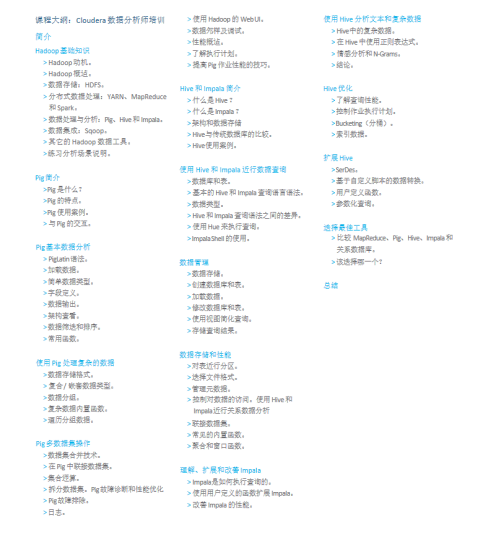 Cloudera大学提供的为期四天的数据分析培训课程专注于Apache Pig、Hive和Cloudera Impala,将教会您如何将传统的数据分析和商业智能技术应用到大数据领域。Cloudera为数据专业人员提供了基于SQL和其它熟悉的脚本编程语言的工具,用来访问、操作、转换和分析复杂数据集。