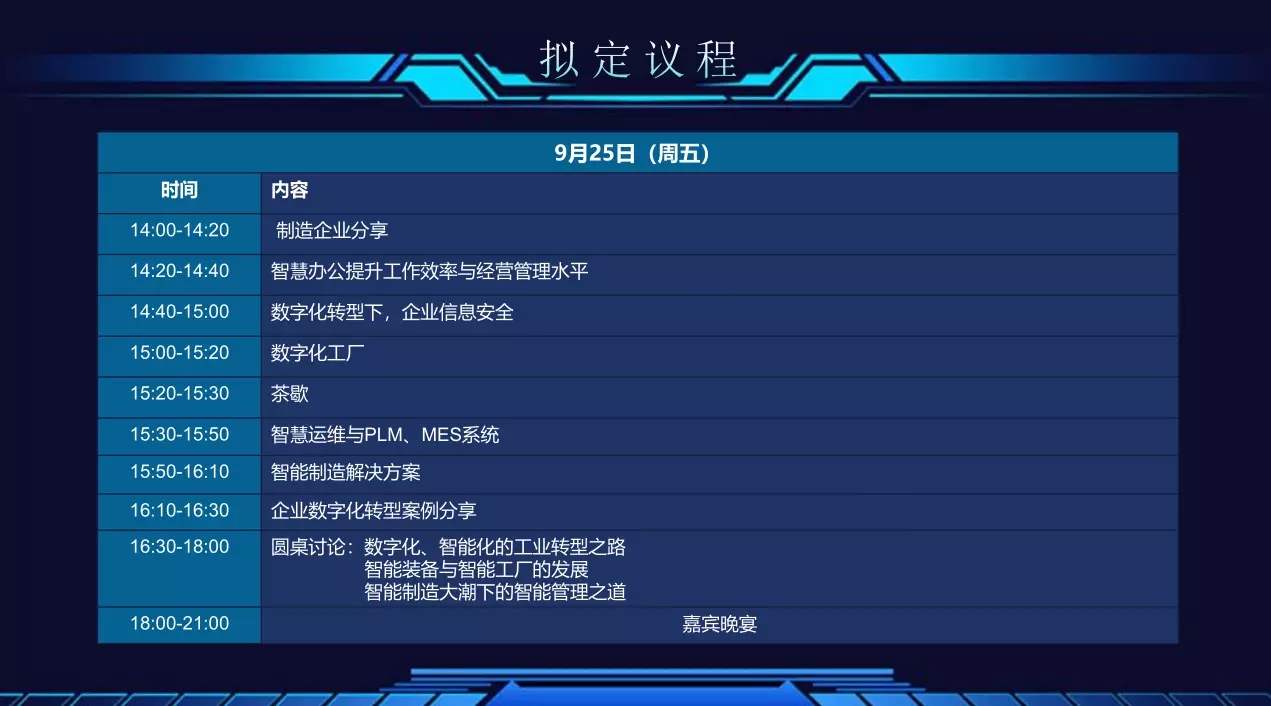 为此在成功举办**届会议基础上,第二届安徽省制造业数字化转型峰会定于2020年9月25日在合肥举办,届时邀请相关部门、专家、用户单位与国内外制造业服务商、重点用户单位参加。